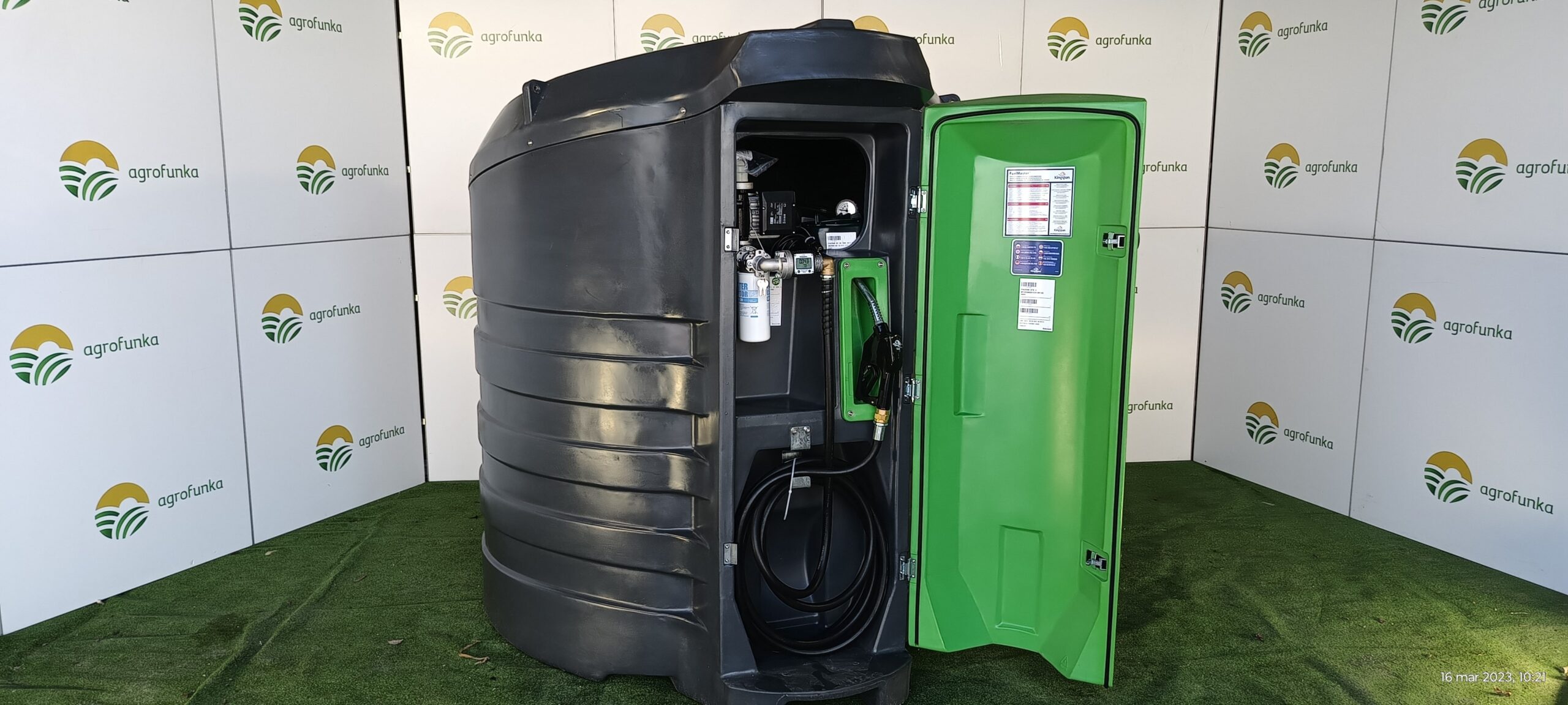 Zbiornik dwupłaszczowy z polietylenu z obudową dystrybutora.