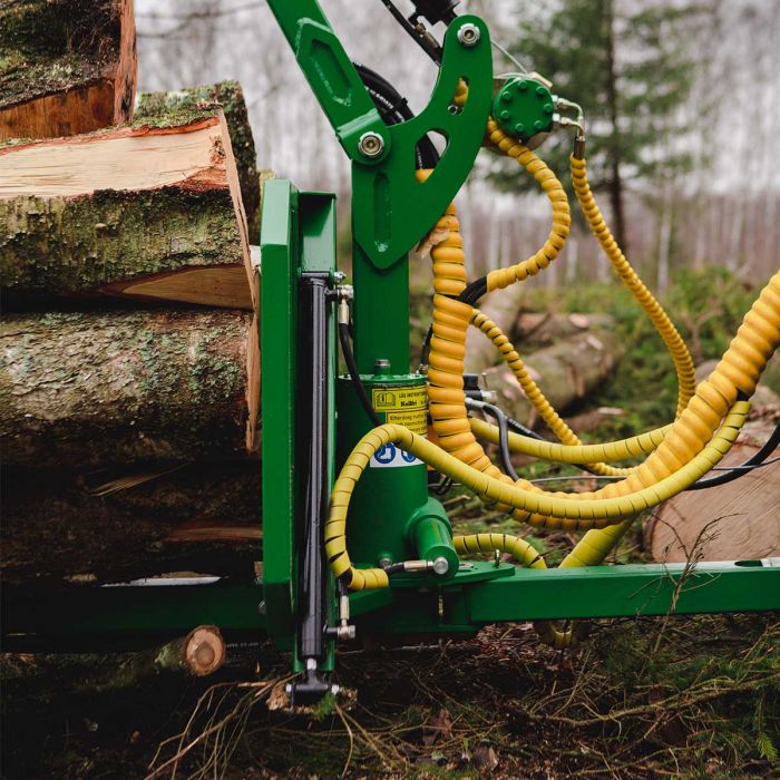 Podpory hydrauliczne gwarantują stabilność przyczepy przy załadunku i rozładunku. Cała hydraulika oraz okablowanie są zabudowane lub założone w bezpieczny sposób, co pozwala zminimalizować ryzyko uszkodzeń zewnętrznych. Przyczepa leśna jest dostarczana z żółtymi zabezpieczeniami żurawia.